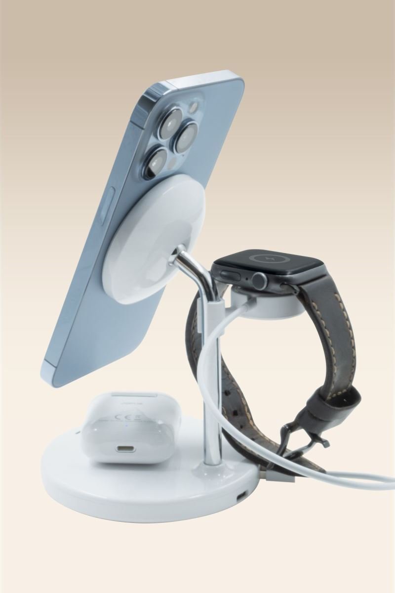Apple kullanıcıları için özel olarak tasarlanan Simex SPS-05 Triplo, iPhone, Apple Watch ve AirPods cihazlarınızı aynı anda kablosuz olarak şarj etmenize olanak tanır. Kompakt yapısı ve sade tasarımı ile hem şık hem de işlevseldir.
